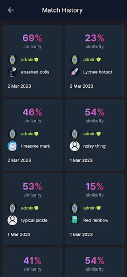 - Matching - the fun part. After answering all those spicy questions, you can match your answers with strangers in the match pool or your friends through your match code. A match report will be generated for the both of you, and you can start discussing away!