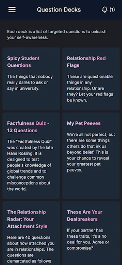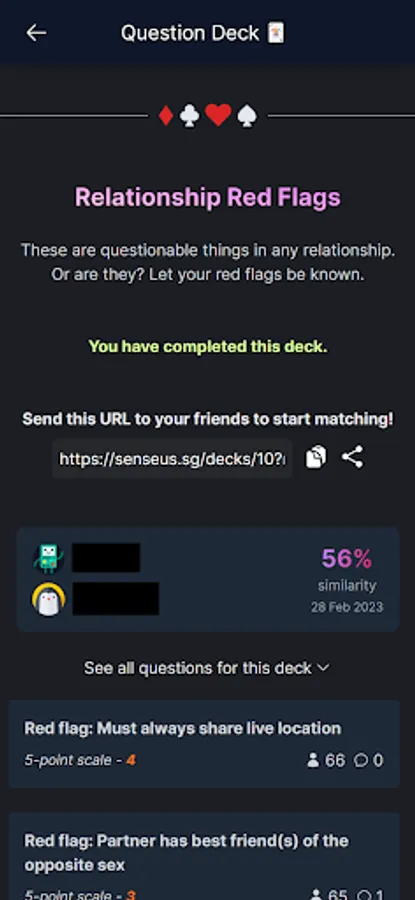 - Question Decks - this is a big one. Your attachment style, pet peeves, darkest secrets... these are targeted question decks that cater to a specific niche, and you can match these decks with your friends. Fun!! Do note that all questions in question decks have to be completed before matching.