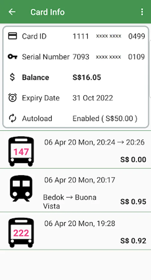 The app reads info from the card via NFC, shows the remaining card balance, card expiry date, card serial number and autoload amount etc. The app also shows the transit history, the amount be deducted during each trip, and when the amount is been deducted.