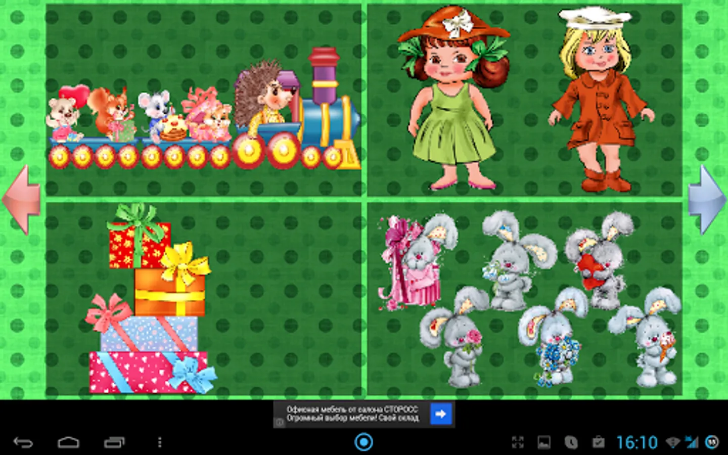 The update games for children "soobrazhalki" introduced new features: Setting animation effects to choose any level of the game, indicated by the arrow go (back, forward, again). Just a game for children provides new levels: the study of forest and animals, host names, colors.