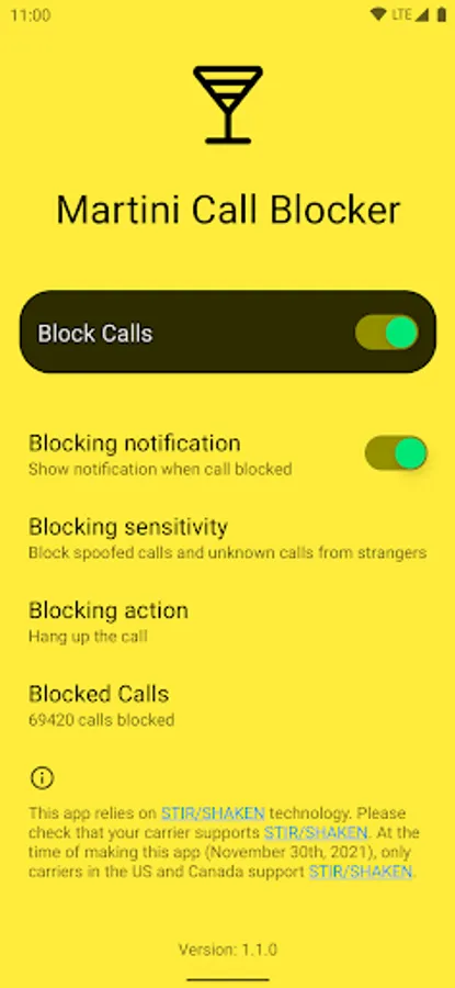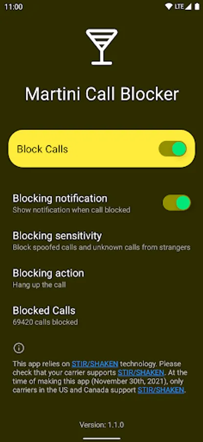 Martini Call Blocker is a call blocker that relies on the STIR/SHAKEN technology (see https://en.wikipedia.org/wiki/STIR/SHAKEN). At the time of making this app (November 30th, 2021), only carriers in the US and Canada support STIR/SHAKEN. Please check that your carrier supports STIR/SHAKEN before using this app.