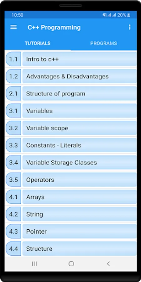 C and C++ Programming app includes over 80 lessons split into 9 levels that cover basic concepts, data types, arrays, pointers, conditional statements, loops, functions, classes and objects, inheritance & polymorphism, templates, files and exceptions.
