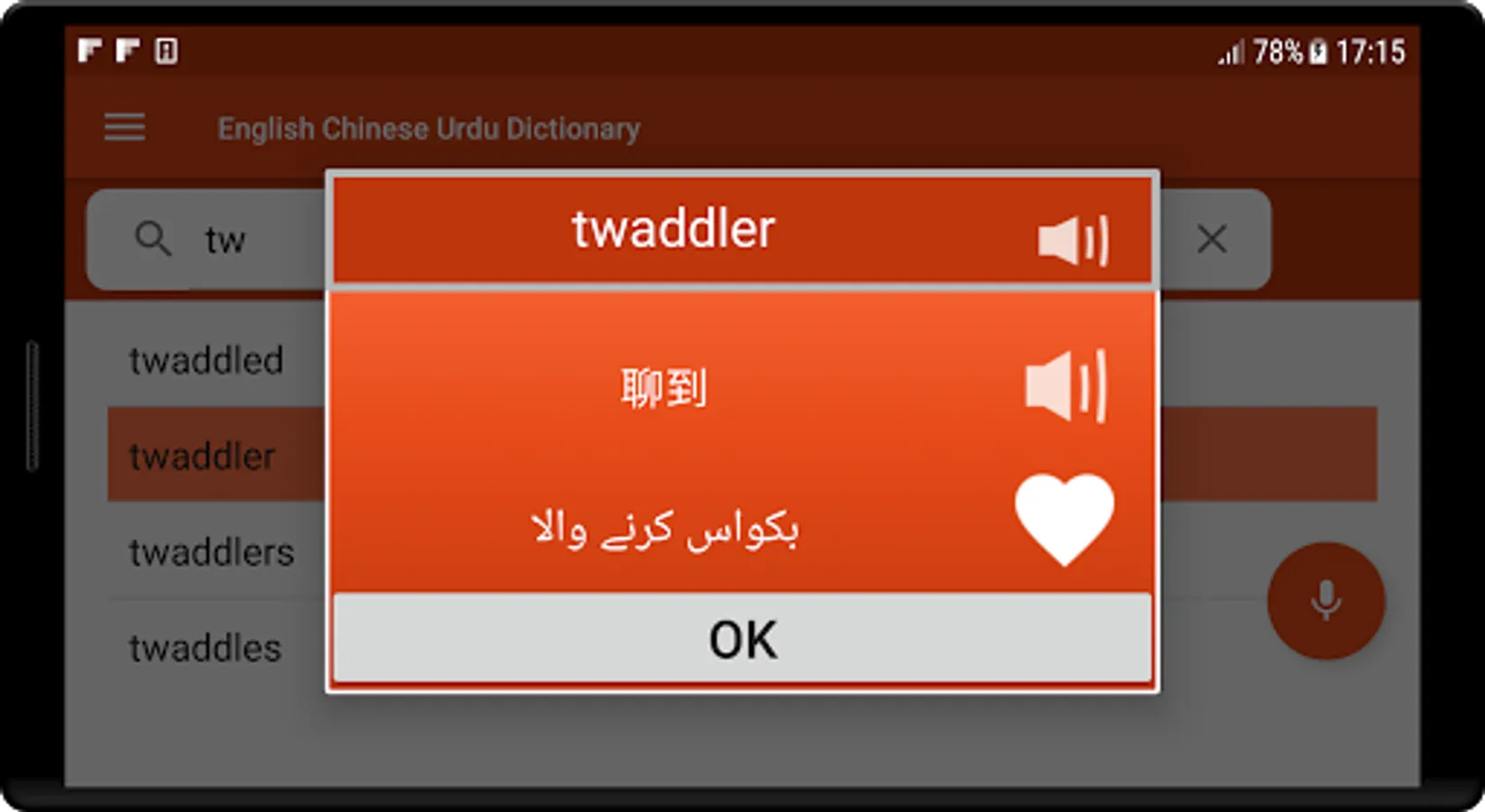 This app will expand your English Chinese and Urdu vocabulary or find just the right word to complete your task, our comprehensive word selection, simple search options and new UI design will have you using this app every day.