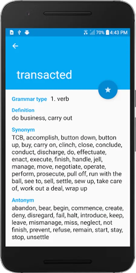 The English Dictionary new feature which make this English Dictionary efficient from other is when you touch in meaning detail on any word English Dictionary app will show the whole Dictionary of touched word.