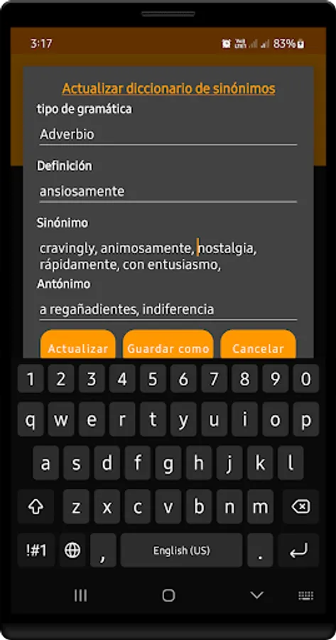 Add word: add word option will give an extra feature to add new and required word in Spanish Thesaurus word database, after searching user will find that added word in suggestion list and also their whole details like Grammar Type, Definition, Meaning, Synonyms and Antonyms.