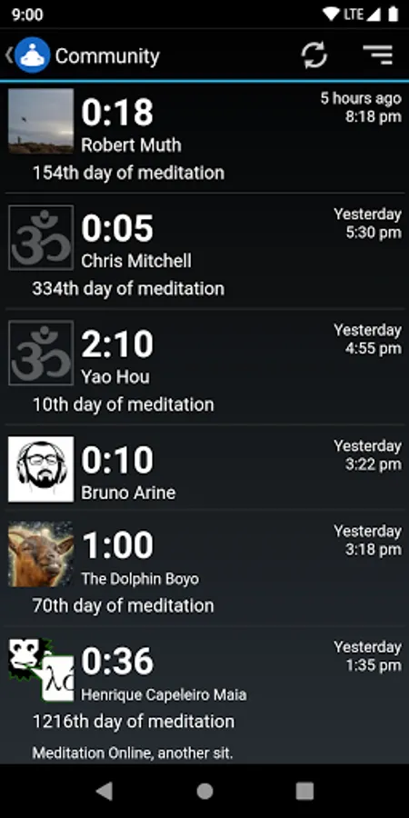 A major feature in this application is the ability to share your sessions online. Though entirely optional, sharing your progress online adds another dimension to your accountability. Now that you've gone public, as your meditation streak increases more users will see it as a goal of their own. One user has posted over 500 days of consecutive days of meditation.