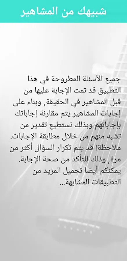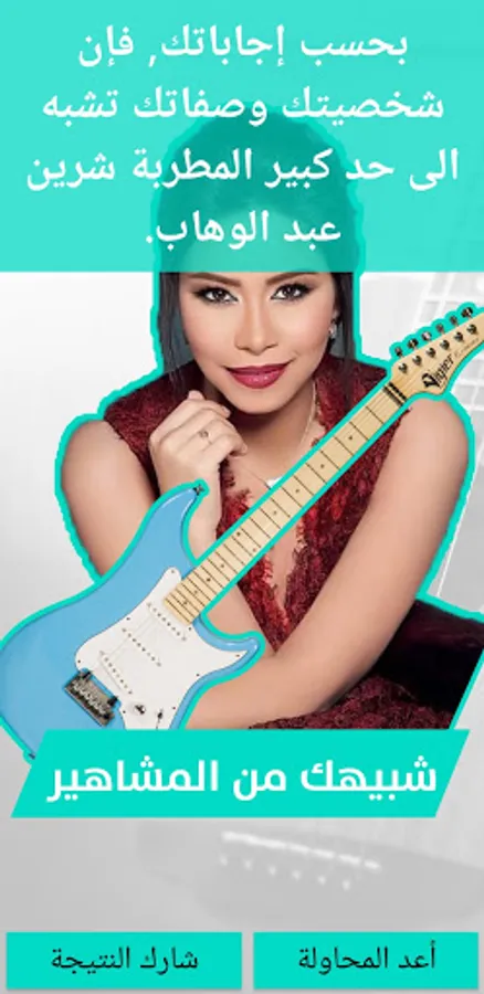 By answering the questions posed in the application, you have answered the same questions that were asked of Arab celebrities, in TV and radio interviews, we compare the answers that you answer with the answers that Arab celebrities answered, and thus we can identify the artist closest to your way of thinking and the closest To your answers, with this analysis, we can say that you are like one of the stars of the Arab world.