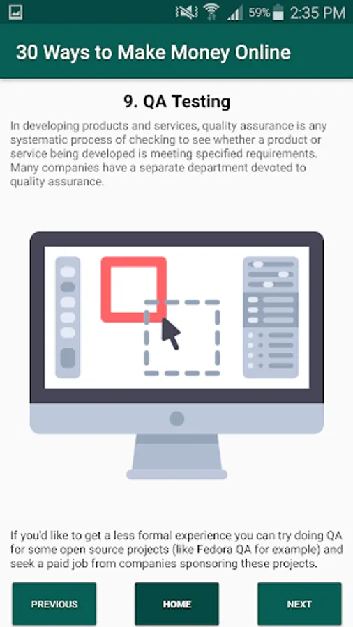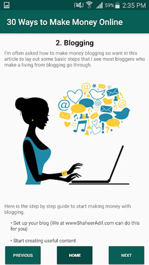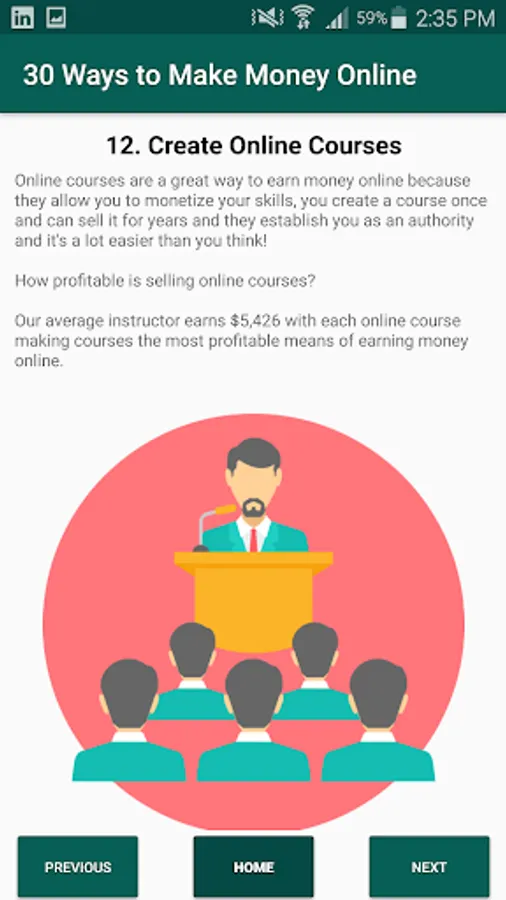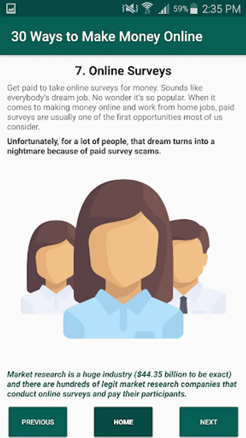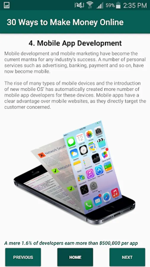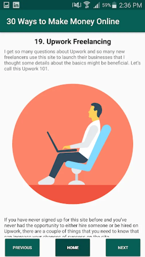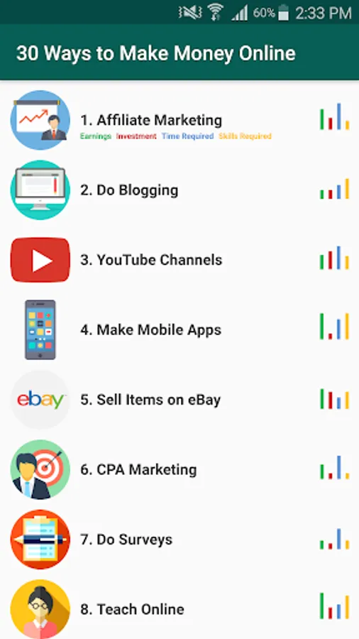 It has 30 ways to make money online that anyone can use to make money. The app also shows how much time, efforts and skills you need for each method.