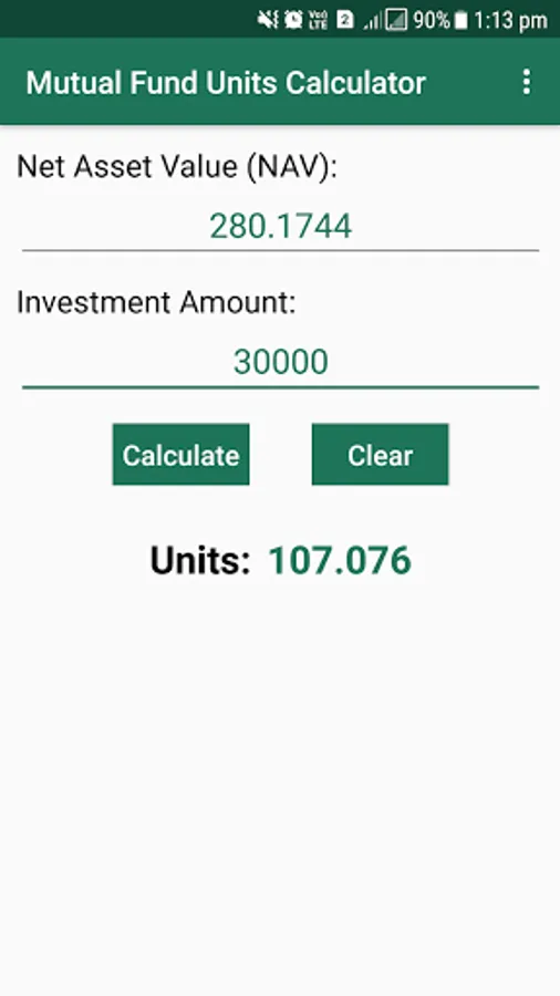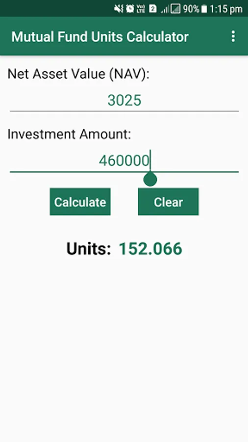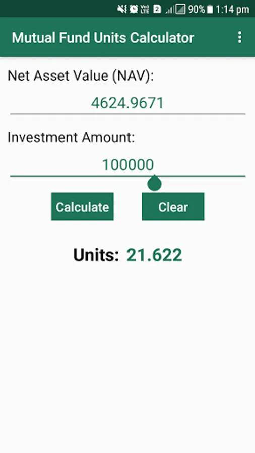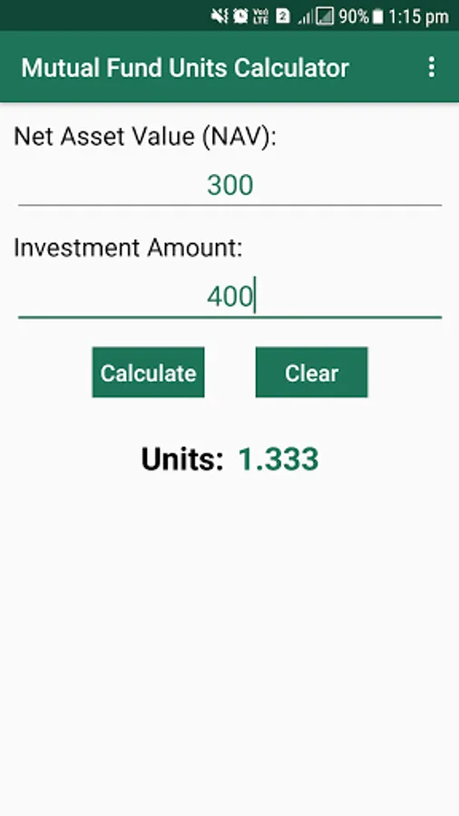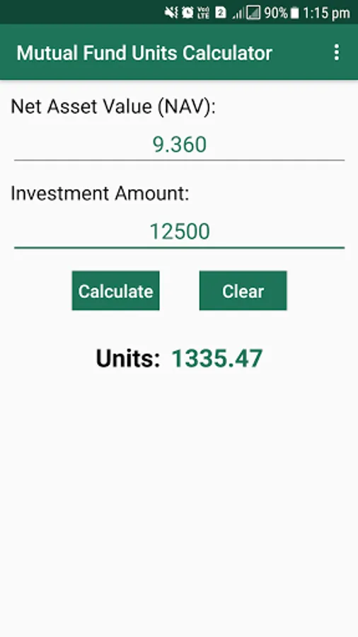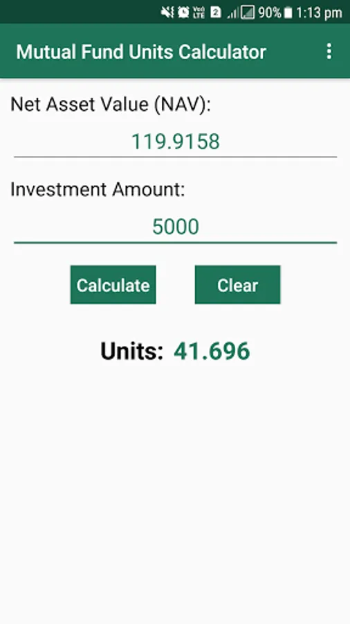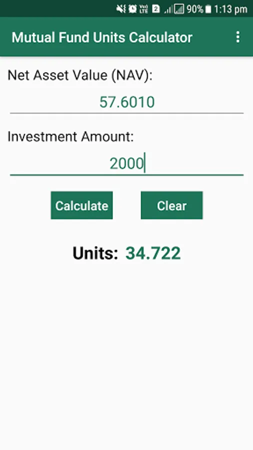 This is very simple app to calculate Mutual Fund Units by entering Net Asset Value (NAV) and Investment Amount. In this app NAV and Investment Amount supports up to 20 digits including the decimal places. This app easily calculates units up to 3 decimal places. Most amazing feature of this app is that calculation does not required any Internet or Wi-fi connection, this app works offline. This android application is very simple to use.
