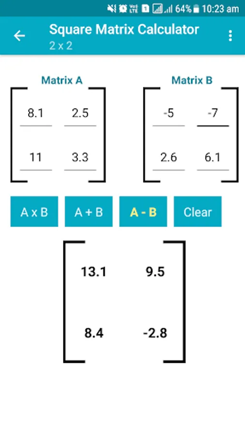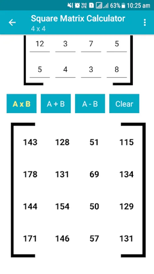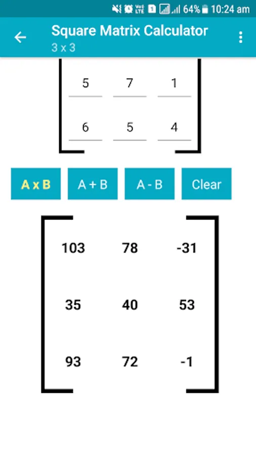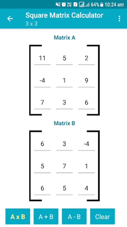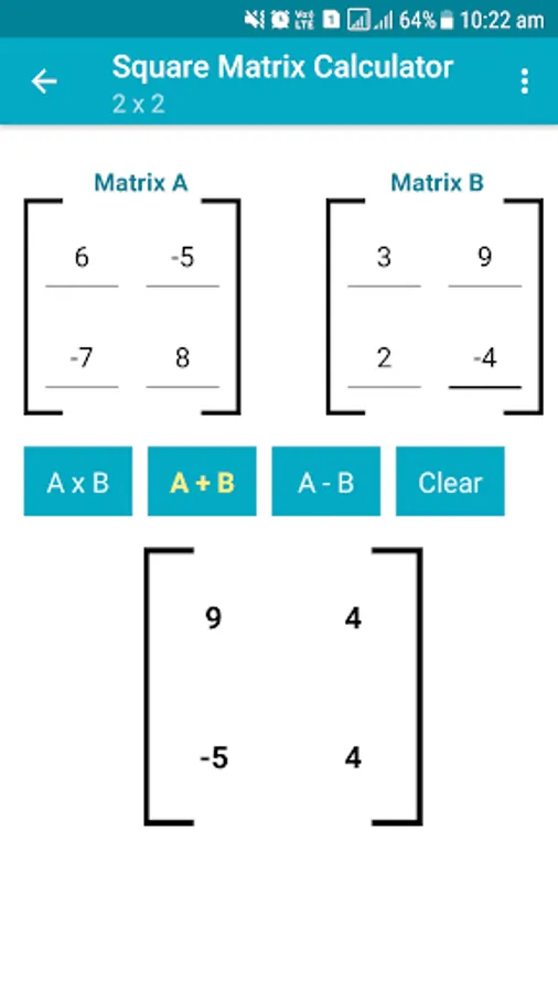 of two square matrices. This app can calculate 2x2,3x3 and 4x4 square matrices.