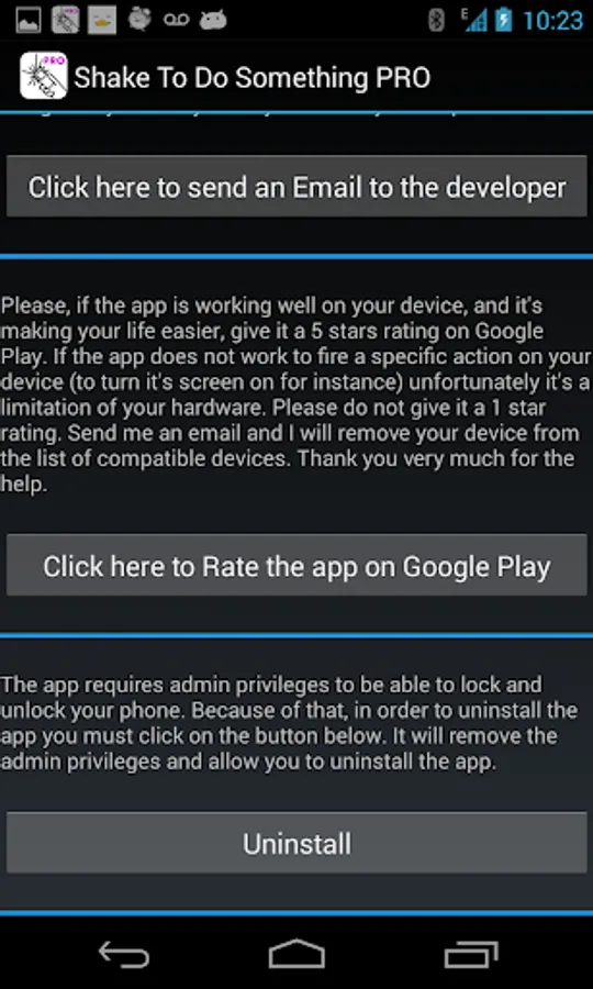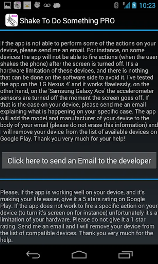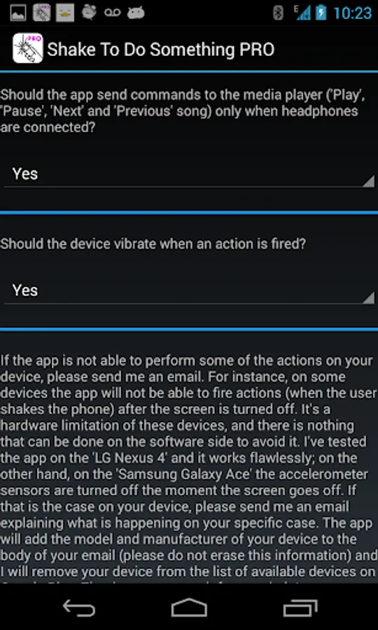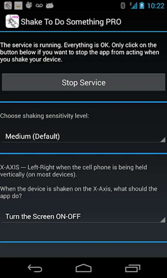 My main focus is on not draining the battery, and it won't. Let it run for a day and then check the app's battery consumption. It should be minimal (as opposed to other "Shake to do something" apps available on Google Play).