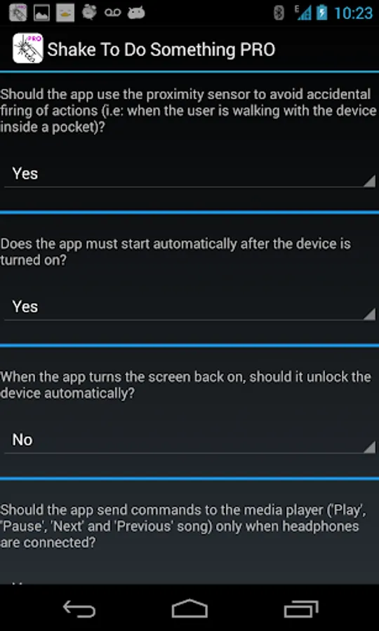 Unfortunately, on some devices the app will not be able to fire actions when the user shakes the phone after the screen is turned off. It's a hardware limitation of these devices, and there is nothing that can be done on the software side to avoid it. For instance, I've tested the app on the 'LG Nexus 4' and it works flawlessly; on the other hand, on the 'Samsung Galaxy Ace' the accelerometer sensors are turned off the moment the screen goes off. If that is the case on your device, please send me an email (there is a button on the app to do it) explaining what is happening on your specific case.
