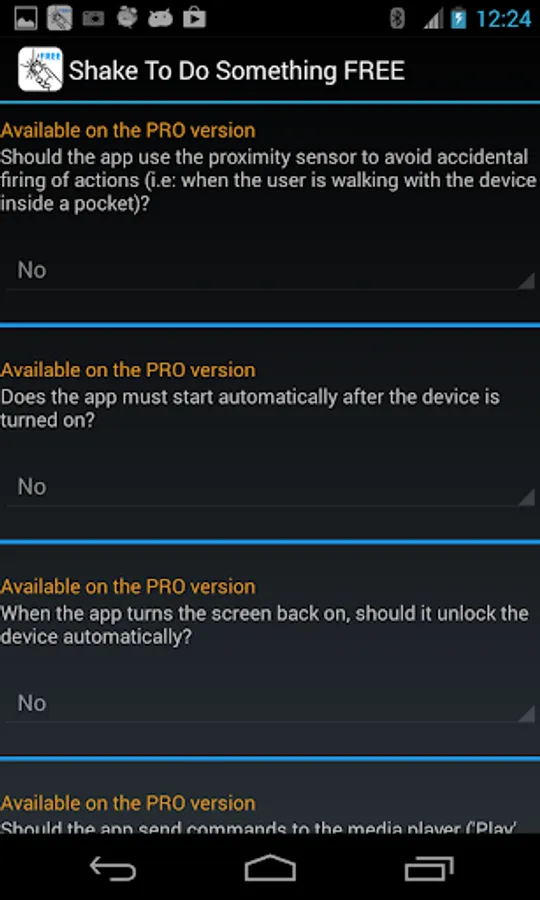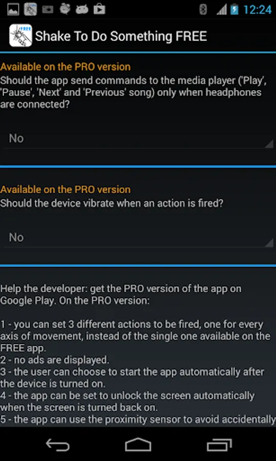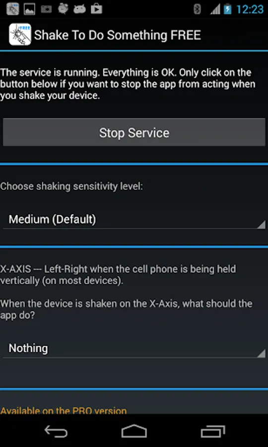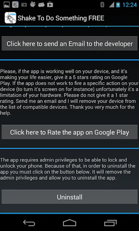 My main focus is on not draining the battery, and it won't. Let it run for a day and then check the app's battery consumption. It should be minimal (as opposed to other "Shake to do something" apps available on Google Play).