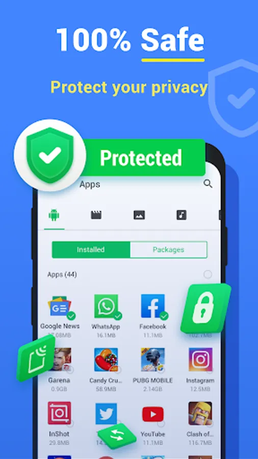 No worry of data lost after getting a new phone. With the super apk share and transfer tool, you can easily transfer files, and mobile data like contacts, SMS, photos, songs, videos, apps and any other files from your old phone to the new one.