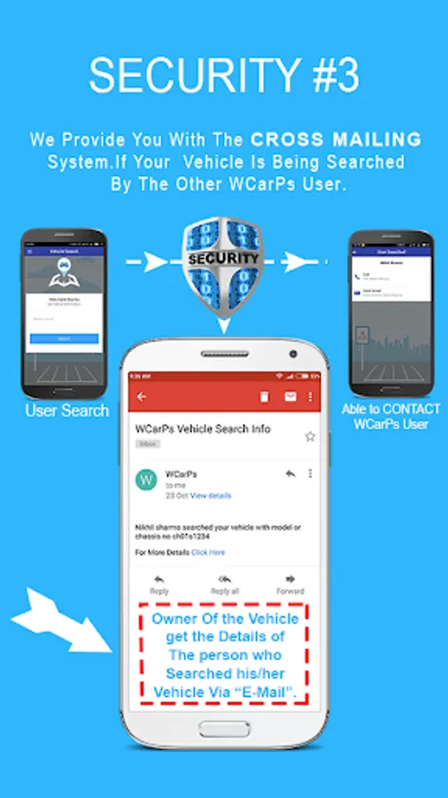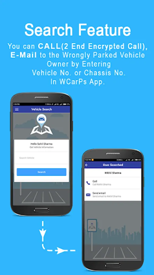 It Provides the Name and an Encrypted Number of the Wrongly Parked Vehicle Owner by Entering His Vehicle No. Or Chassis No. You Can call him With This Encrypted numbers. SMS and Email Will Be sent to him automatically.