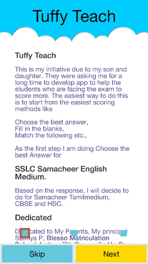 Tuffy Teach is specially designed for TamilNadu SSLC Samacheer English Medium Students who are going to take the board exams. This app will make the students to take the test 10 questions at a time and feel them stress free. At present this application consists of the questions below for each subject.