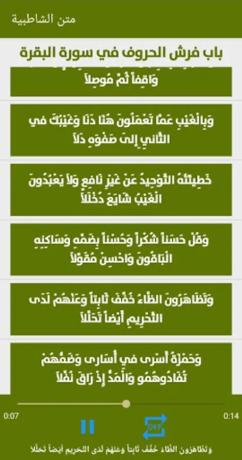 The body of Al-Shatabiya is written and divided into sections with listening, with the ability to repeat each verse separately to facilitate memorization