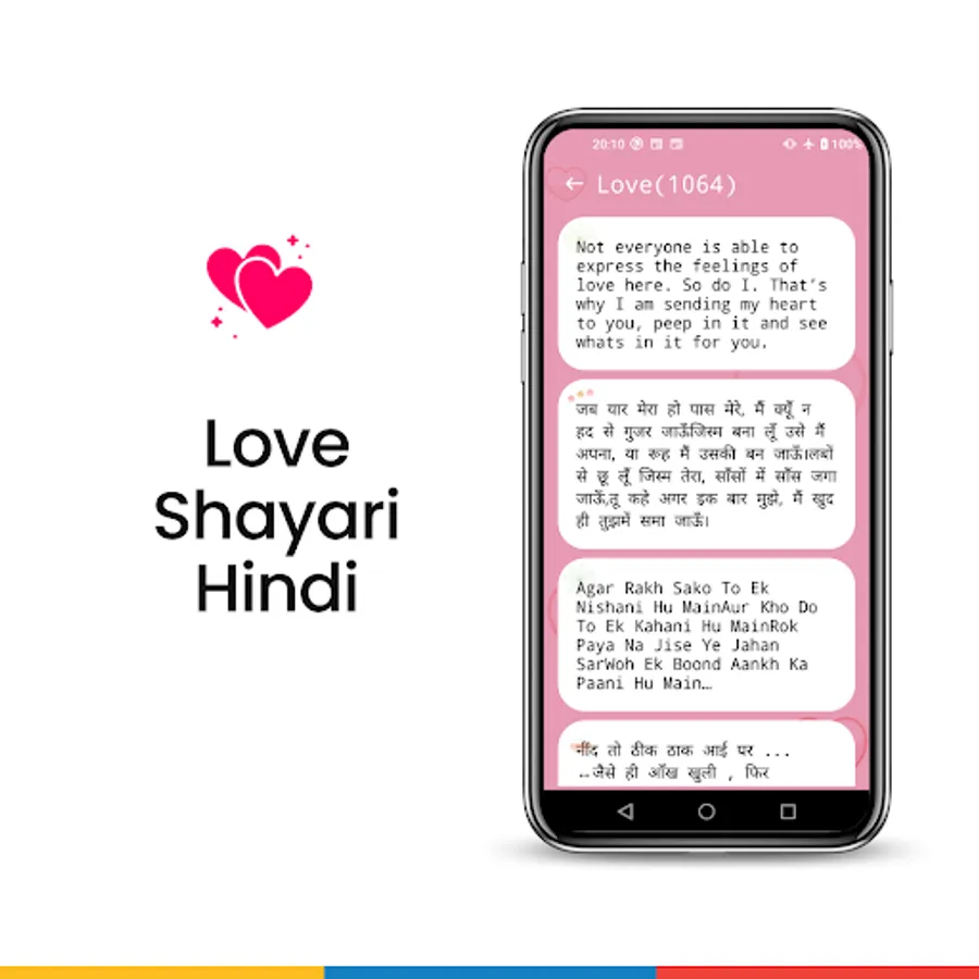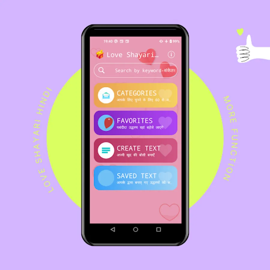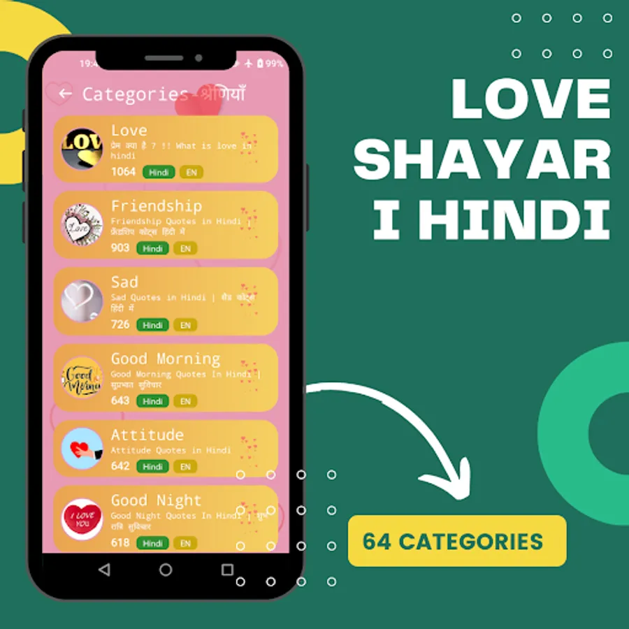 In Love Shayari Hindi app, we added a many types of hindi shayari 64 categories like birthday wishes for boyfriend in hindi, birthday wishes for love in hindi, good morning quotes for love in hindi and many more....Love Shayari Hindi is best collection of love status, dosti shayari, heart breaking status.