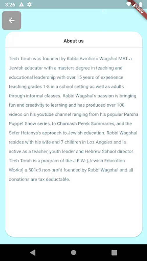 Tech Torah was founded by Rabbi Avrohom Wagshul MAT a Jewish educator with a masters degree in teaching and educational leadership with over 15 years of experience teaching grades 1-8 in a school setting as well as adults through informal classes. Rabbi Wagshul's passion is bringing fun and creativity to learning and has produced over 100 videos on his youtube channel ranging from his popular Parsha Puppet Show series, to Chumash Perek Summaries, and the Sefer Hatanya's approach to Jewish education. Rabbi Wagshul resides with his wife and 7 children in Los Angeles and is active as a teacher, youth leader and Hebrew School director. Tech Torah is a program of the J.E.W. (Jewish Education Works) a 501c3 non-profit founded by Rabbi Wagshul and all donations are tax deductable.