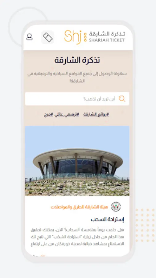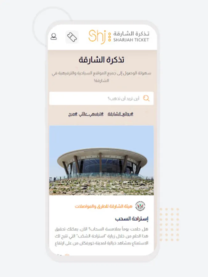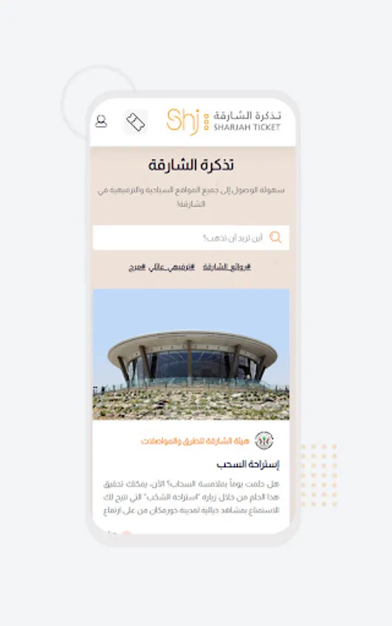 Sharjah ticket application is the first application of its kind that works as a single window and platform to promote leisure and tourist destinations within the emirate of Sharjah from a single application, which allows all categories of visitors to review the advantages of destinations and search for leisure destinations within the emirate of Sharjah by place, purpose and name determined by the administrators of the management and operation of destinations through an easy and attractive design in line with the latest methods of design and development.