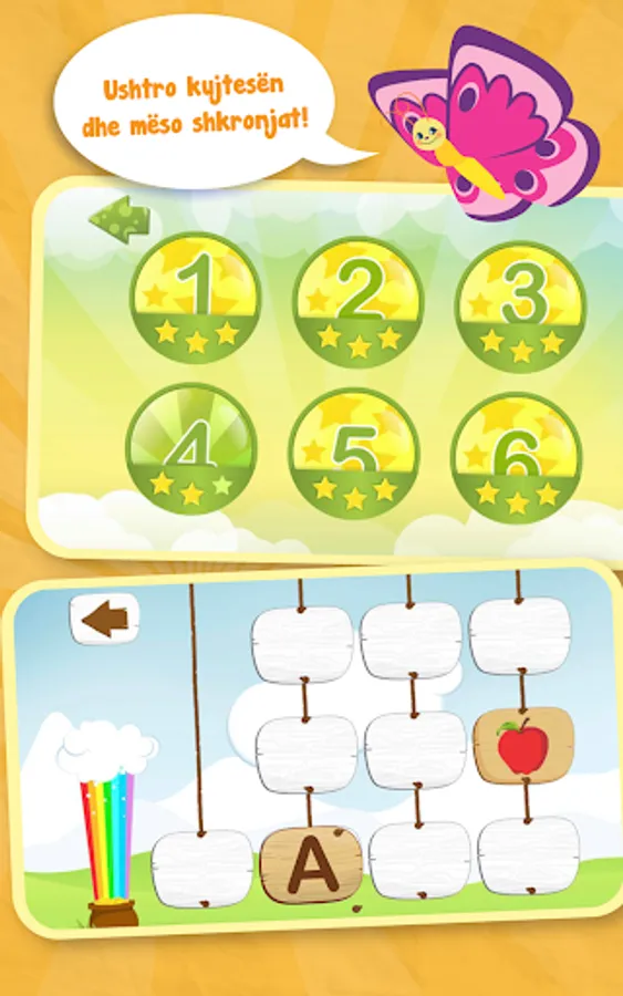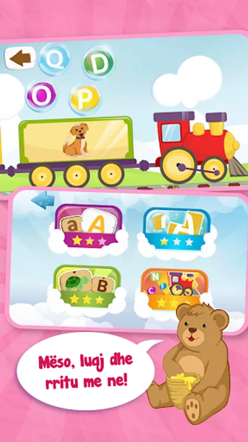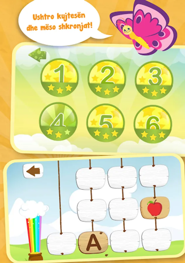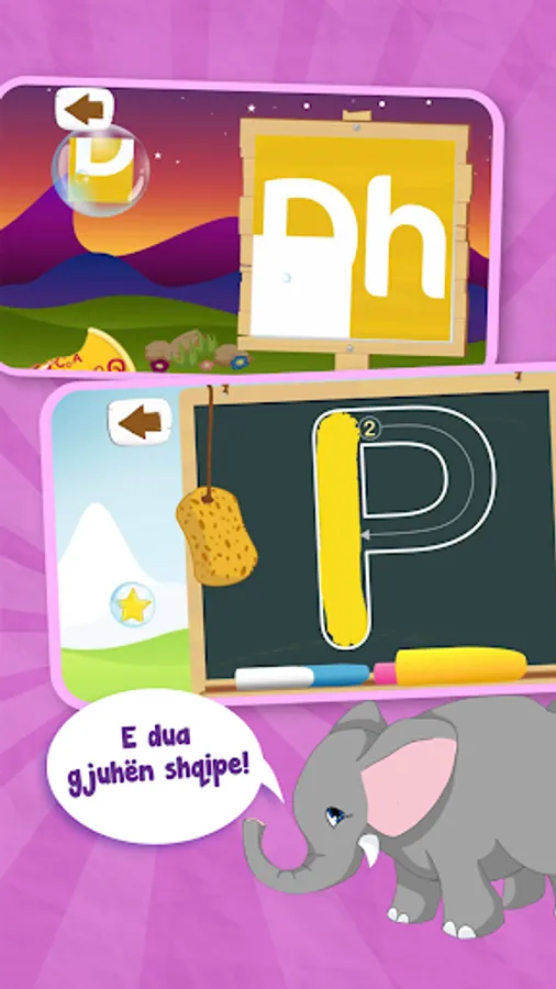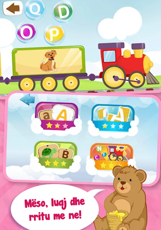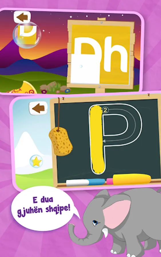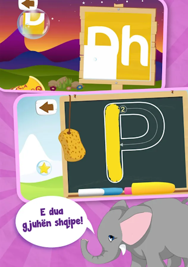 - Shkrimin e shkronjave në tabelë të zezë me katër ngjyra të ndryshme, ku nëse shkruan shkronjën si duhet atëherë merr 3 yjet maksimale.
