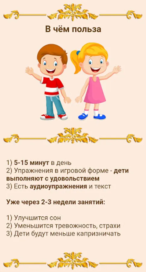 This application contains the top 15 exercises that you can do with your child for 5-15 minutes a day.