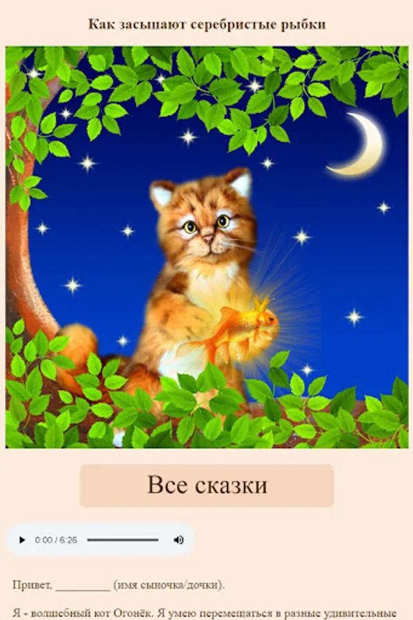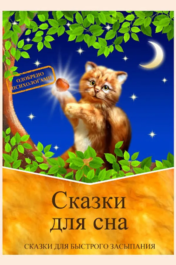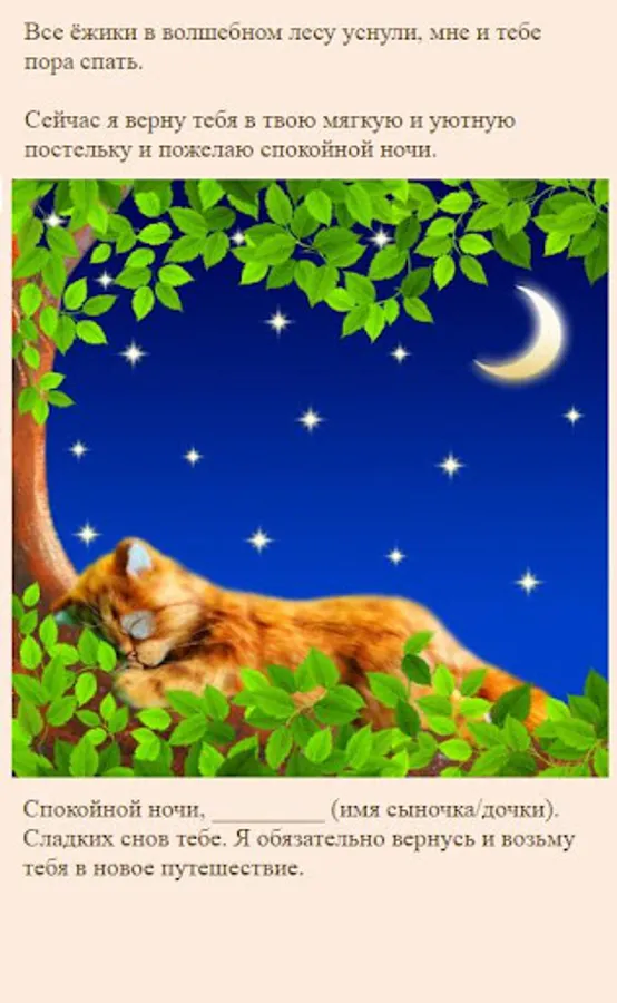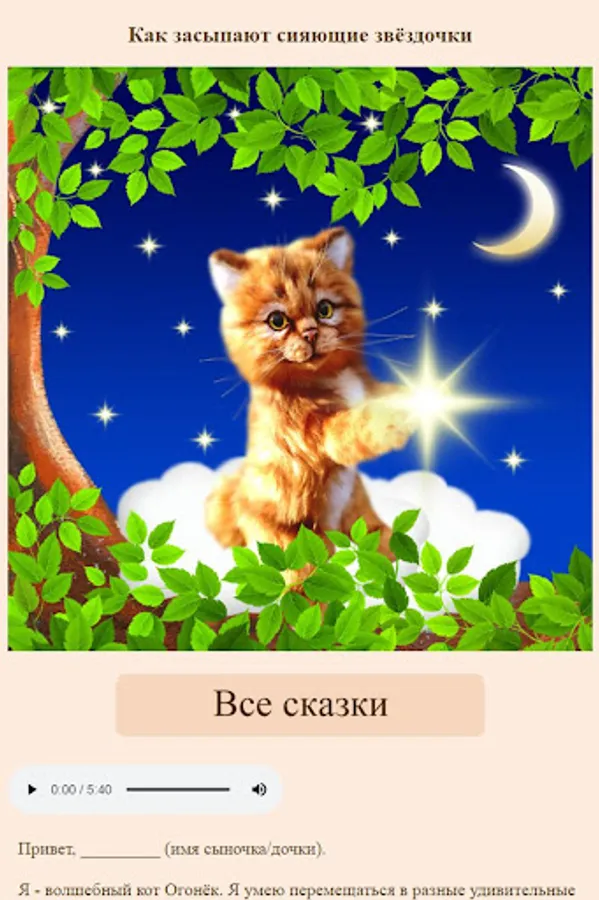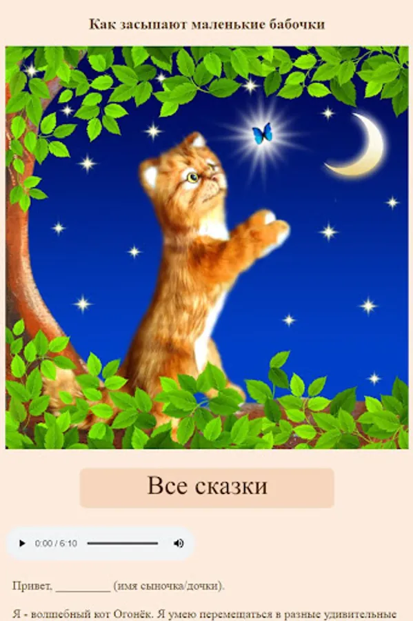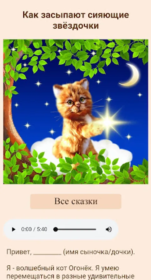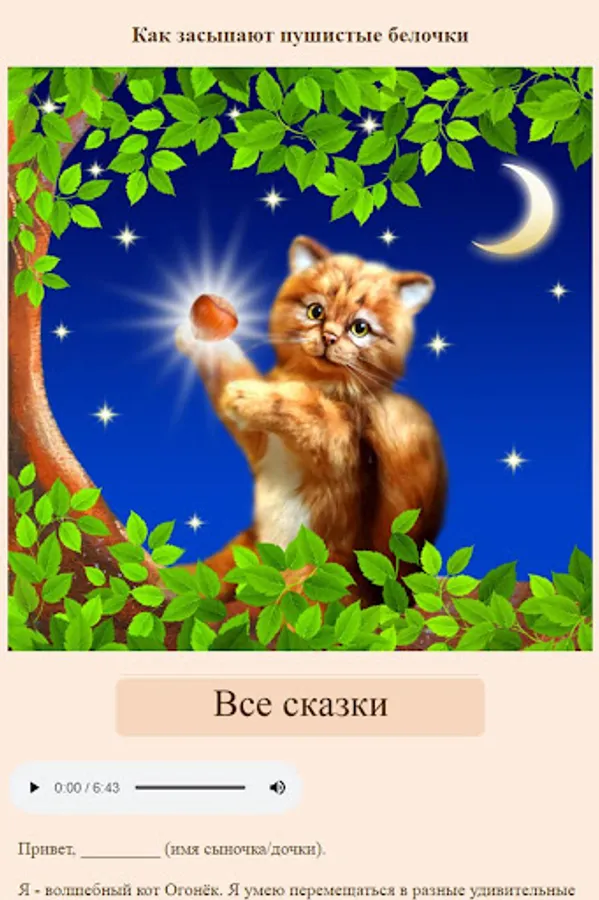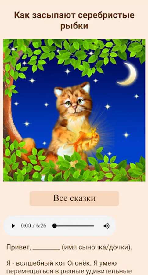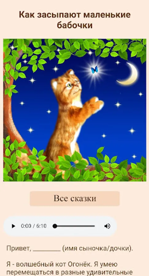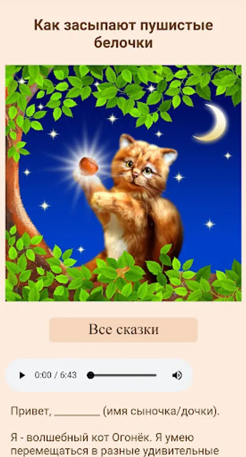 In the application, the magic cat Ogonyok will tell you how to fall asleep: