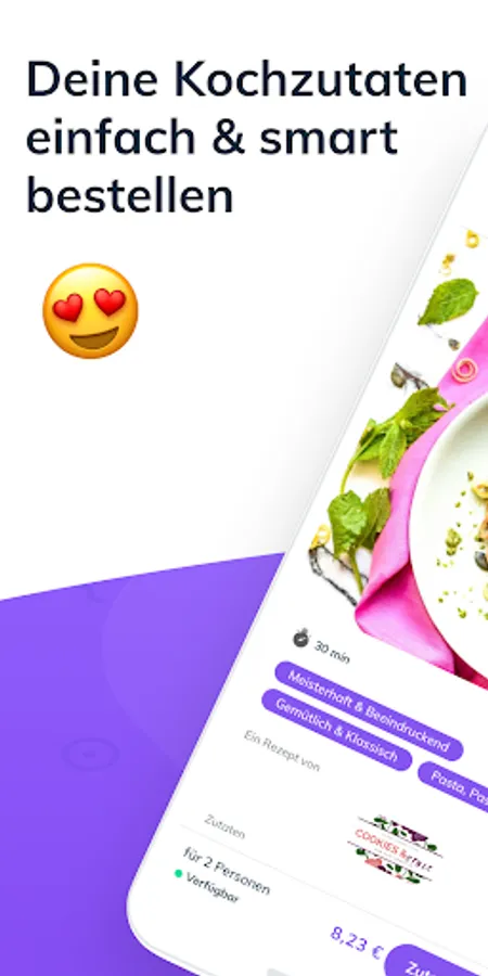 The recipes and ingredients are always tailored to your diet and the current availability of the delivery service. You can be inspired like in a large recipe book that is made for you personally and you can easily order all the ingredients at any time: whether after-work cuisine, family recipes, low carb, 5-ingredient dishes to zero waste and much more.
