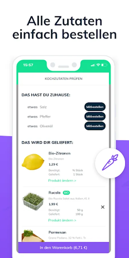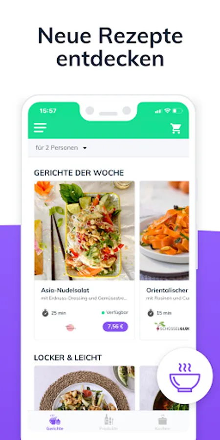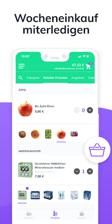 In addition to the cooking ingredients, you can also order the rest of your purchase. You will find all the daily necessities - from pineapple juice to toothpaste - and have access to current offers and your last shopping list. So you can conveniently be supplied with a shopping app and with a delivery.