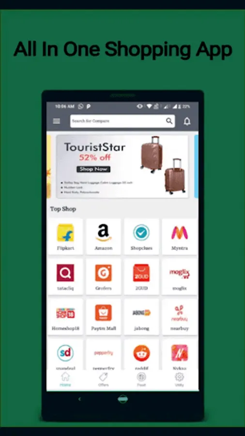 All in one Online Shopping app is a shopping destination for more than 500+ online stores. Some of the major online shopping sites Amazon, flipkart, Paytm, Snapdeal, Shopclues, Myntra, Ebay, jabong, Moglix, olx, zivame, abof, Ajio,TataCliq and many more