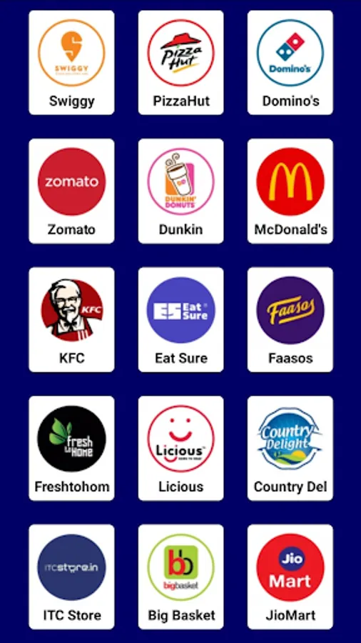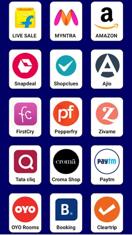 Amazon, Flipkart, Snapdeal, Paytm, Tata Cliq, Aliexpress, Myntra, Ebay, Shopclues, Jabong