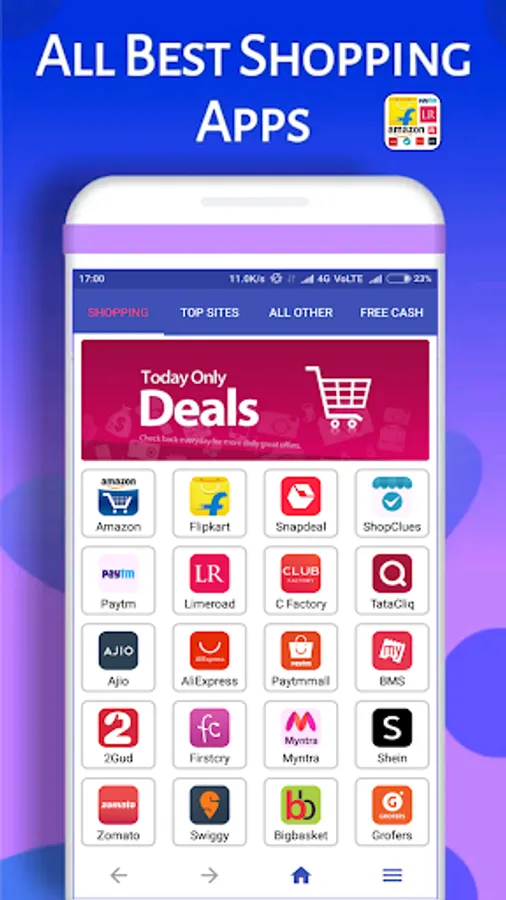 All in one Online Shopping app is a shopping destination for more than 500+ online stores. Some of the major online shopping sites Amazon, flipkart, Paytm, Snapdeal, Shopclues, Myntra, Ebay, jabong, Moglix, olx, zivame, abof, Ajio,TataCliq and many more