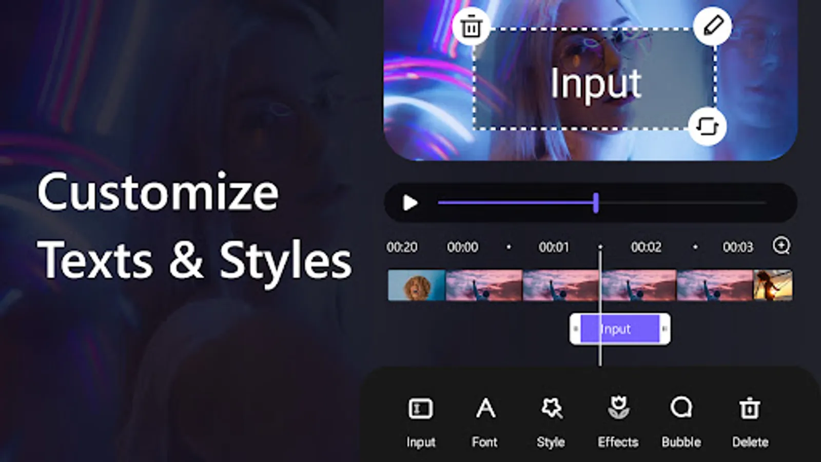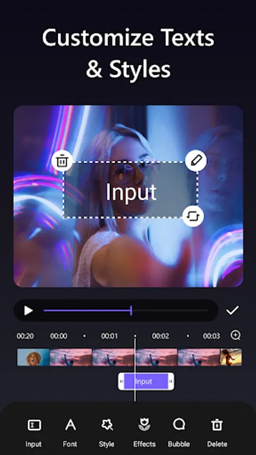 -Input the texts and make subtitles with fonts, styles, effects and bubbles.