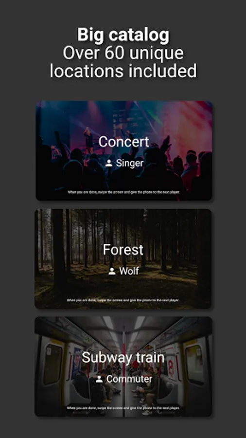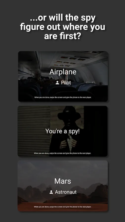 When the game is started, a random location, such as a cinema or a cruise ship, is chosen. This location is then revealed to all players except for one, who is randomly selected to be the spy.
