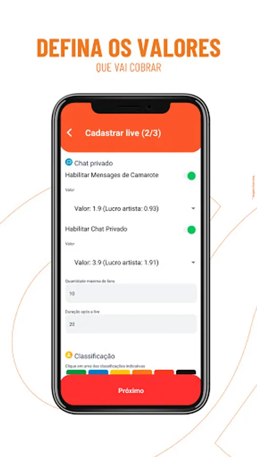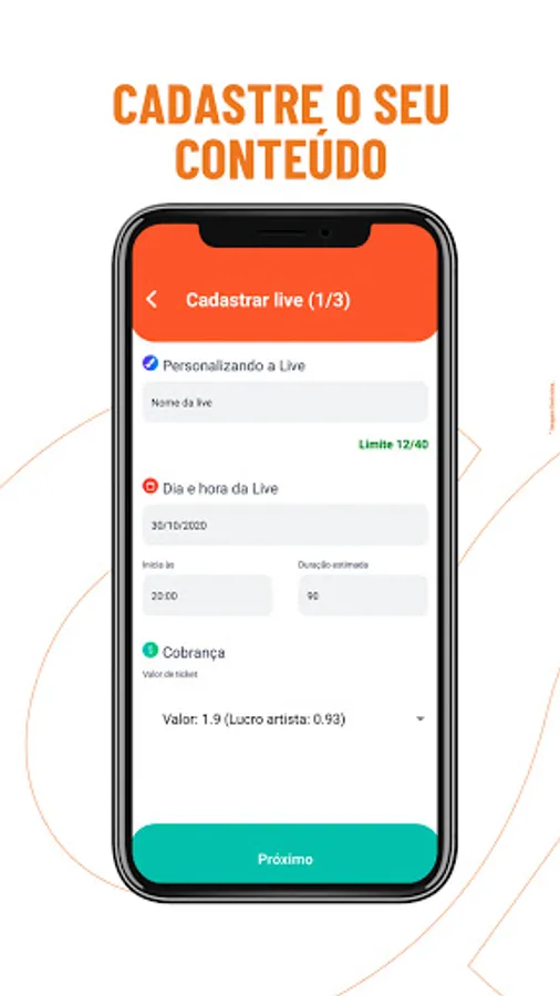 With OnLive Produtor, you define all the rules for interactions with your fans, when you want to make your lives, whether to charge tickets or not, what is the value for your fans' interactions with your content, and what is your availability for actions with them, such as participating in a private chat.
