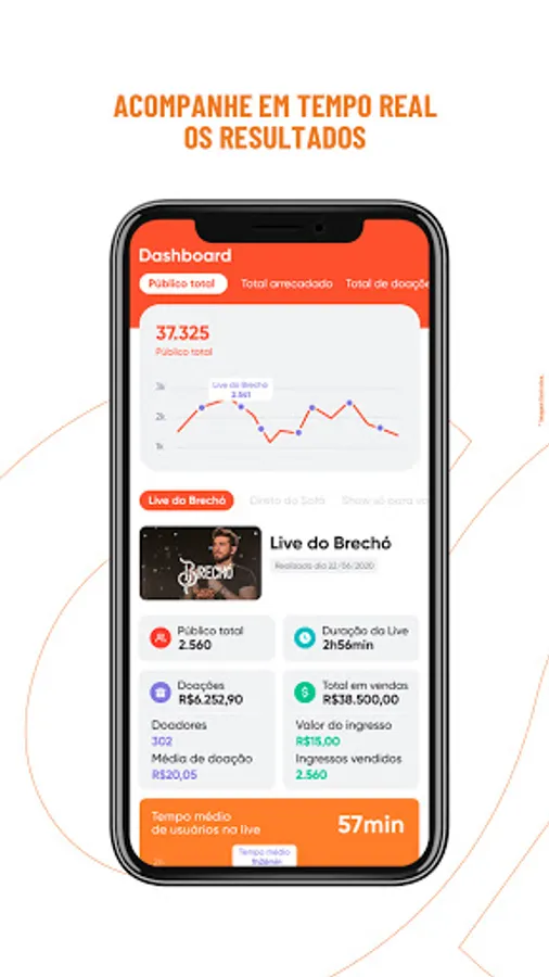 Managing your sponsorships is also simple, register partner brands, manage media formats, and during your live, follow in real time all indicators, such as audience, values of donations collected, volume of paid interactions and performance of your content.