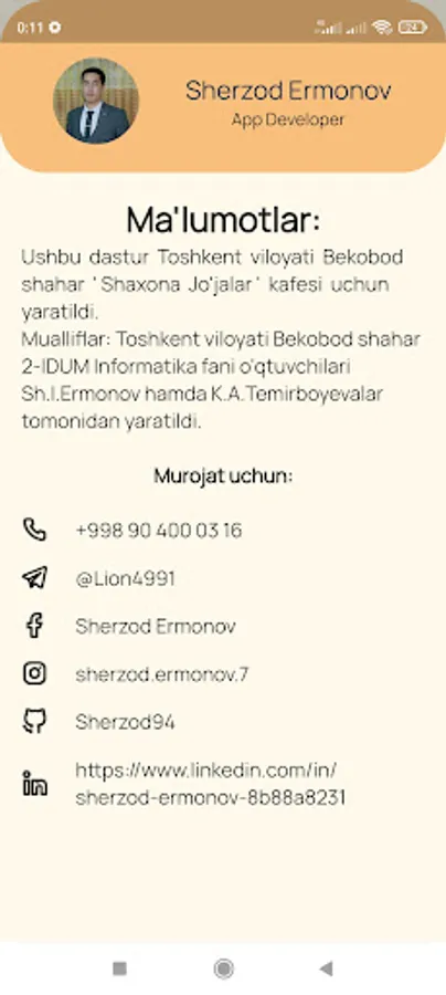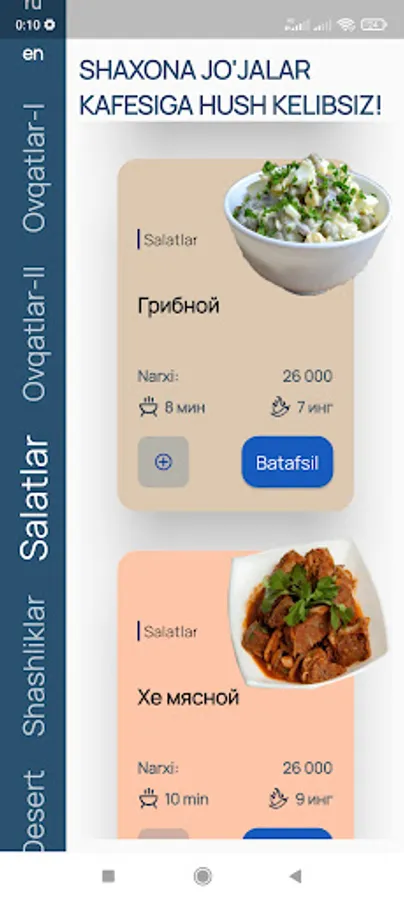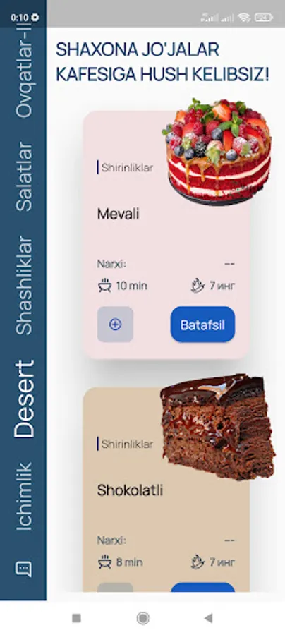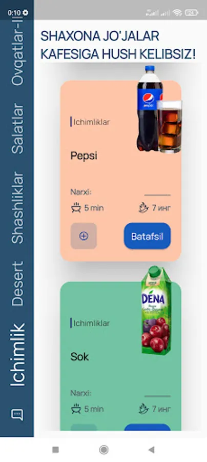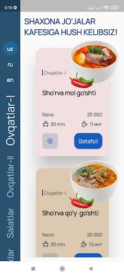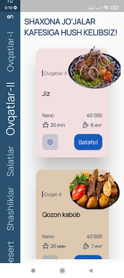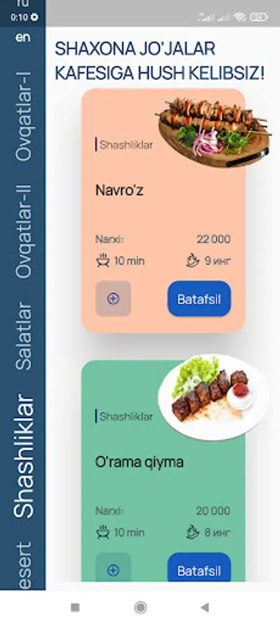Malumot: Toshkent viloyati Bekobod shahrida joylashgan "Shaxona Jo'jalar" kafesi uchun online minyu dasturi. Ushbu dastur yuzasidan taklif,