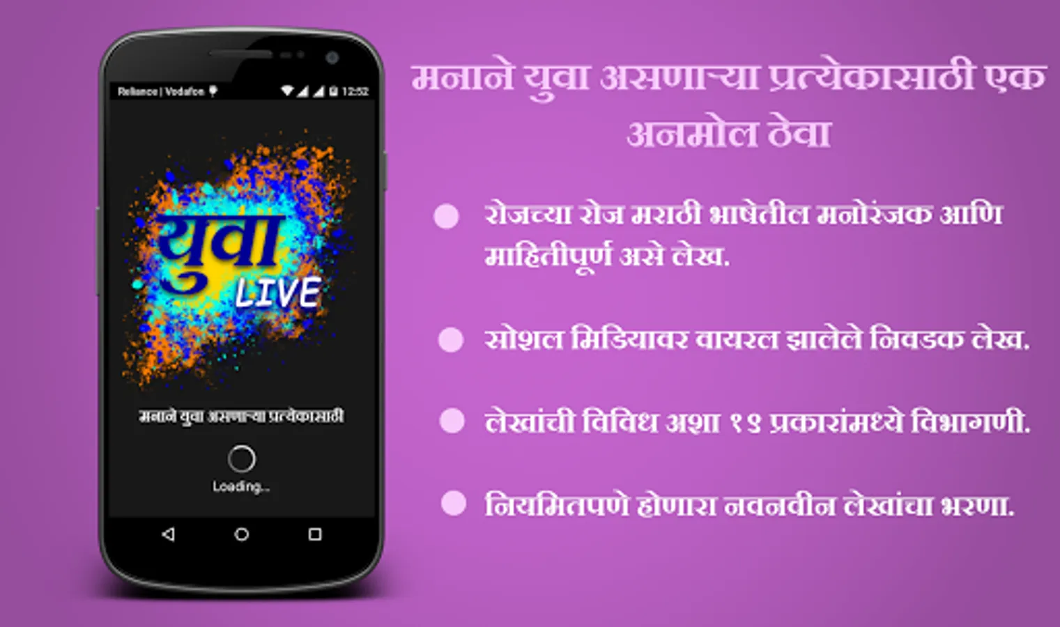 Yuva Live is a app for youth (including all people who are youth at heart). It guarantees daily articles in Marathi language based on 19 main categories of articles. This app ensures daily bunch of entertaining, informative, thought provoking yet some funny hilarious articles.