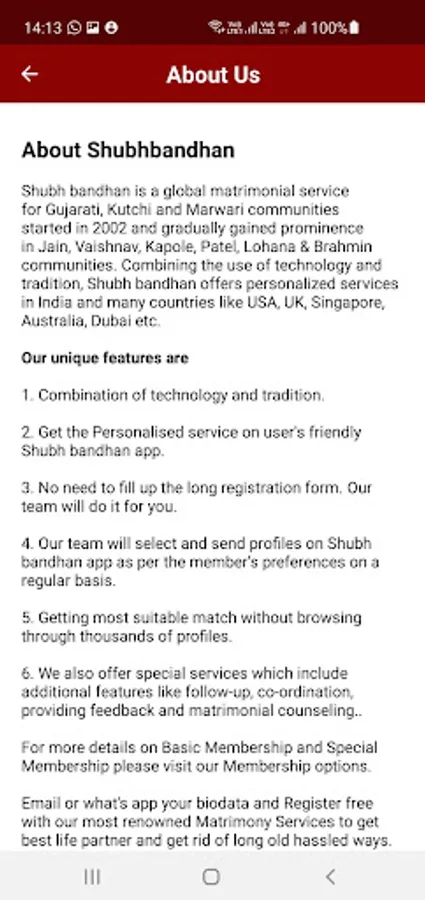 We are pleased to announce that Shubh Bandhan has launched its official unique android app for the benefits of its Members by which they will get the suitable Profiles according to their preferences on their mobile phones maintaining utmost privacy.