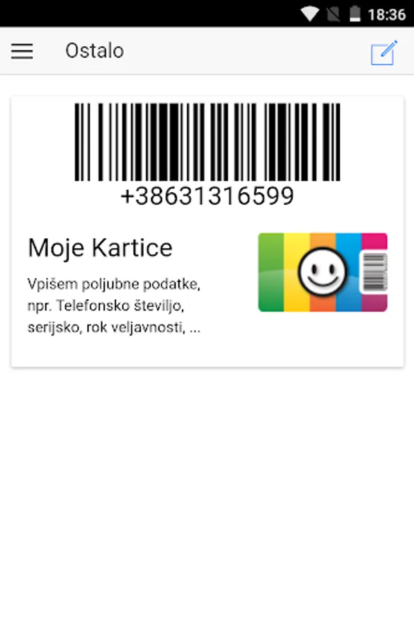 Slovenska aplikacija za shranjevanje članskih kartic, številk zavarovanj, kuponov in kartic zvestobe (ugodni nakupi in popusti), opremljenih s črtno kodo, v elektronski obliki (e-kartica).