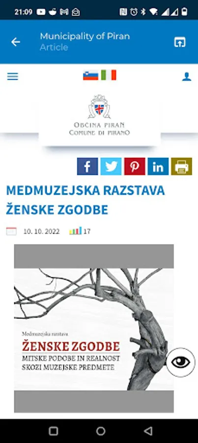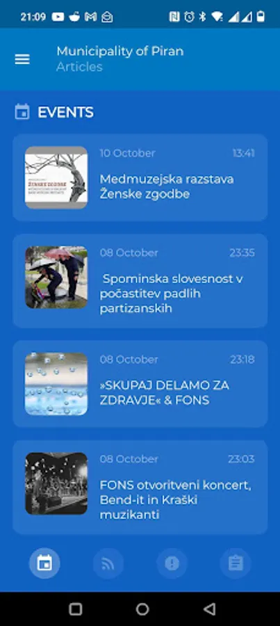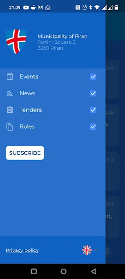 The app enables citizens of the municipality of Piran to subscribe to topics and receive notifications for new articles. Citizens can subscribe to the following topics: headlines, events, reports, tenders and document applications.