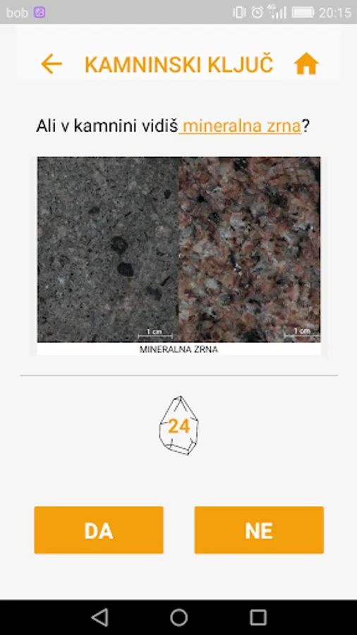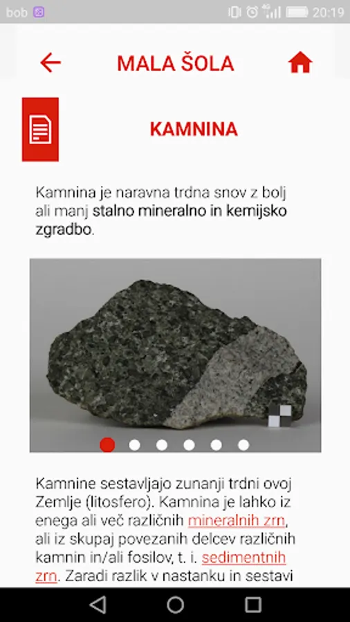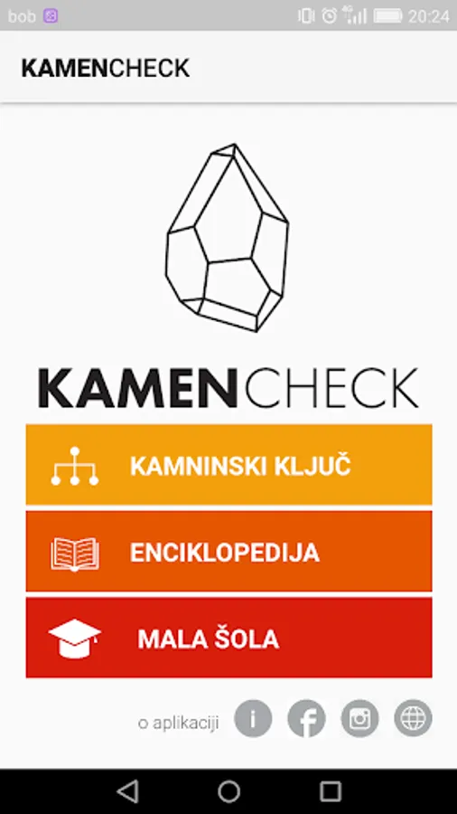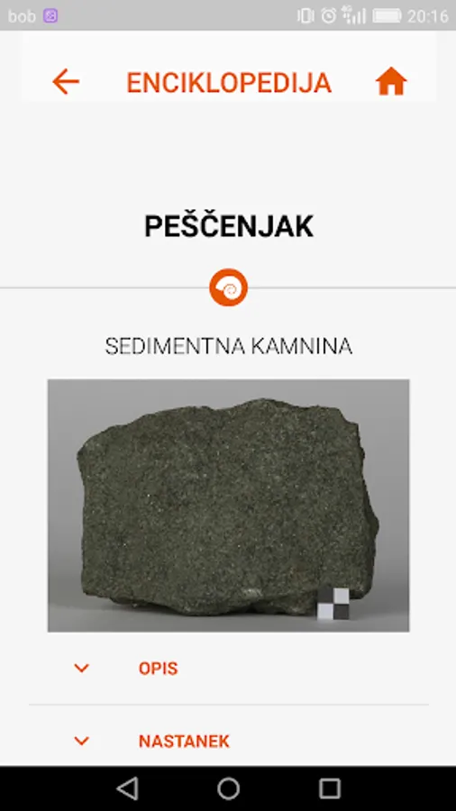 The KamenCheck application is a learning aid that can be used to determine typical Slovenian rocks on the basis of the determination key. It covers three main substantive topics: Stone Key, Encyclopedia and Little School. In the Stone Key, the name of the selected stone is determined by observing and answering a question with YES / NO. The help is in the orange-colored link to the interpretation of geological terms and procedures in the Mali School. The answers lead us to detailed descriptions of the rocks in the Encyclopedia.