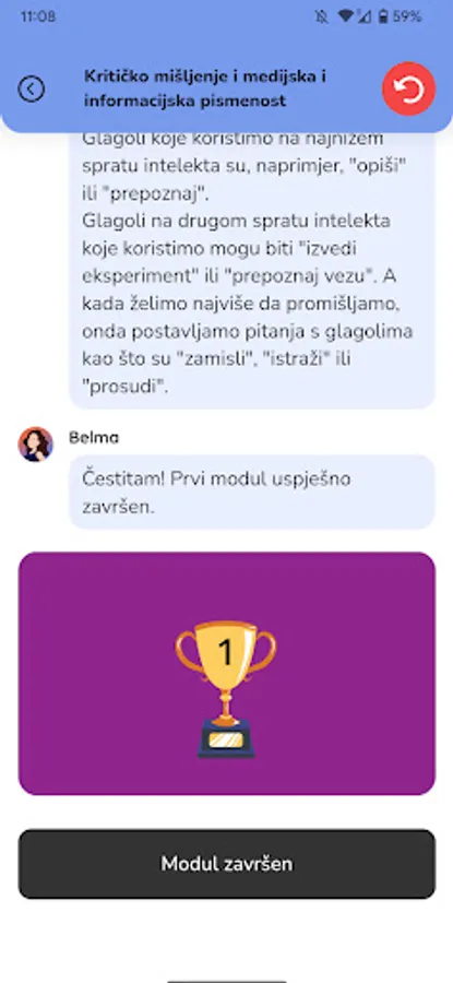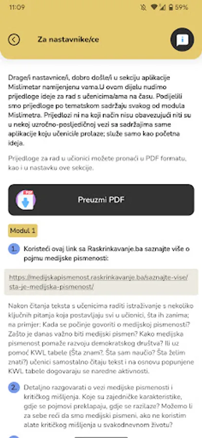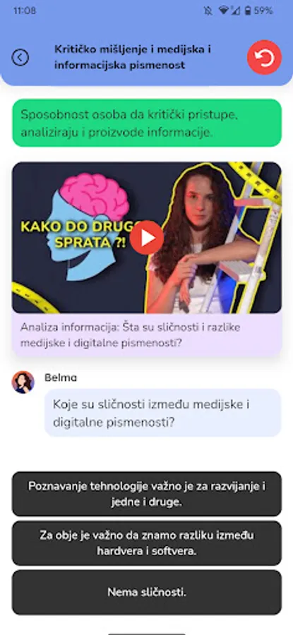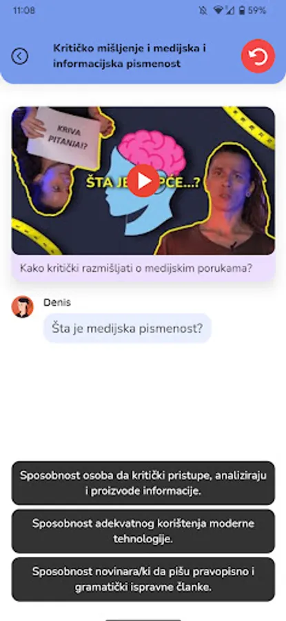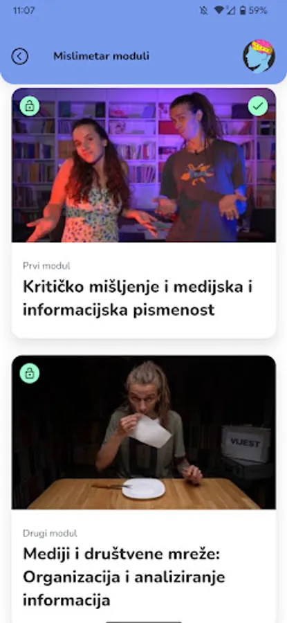 The content of the application is divided into seven thematic modules. The interactive modules are designed to cover different critical thinking and media literacy segments. They consist of videos, textual explanations, pictures and questions for users.