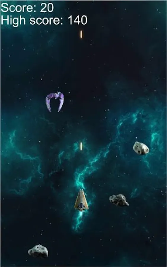 Flying through space, shooting enemy space ships and asteroids. Use device orientation for controlling your space ship position and tap the screen for fire laser beam.