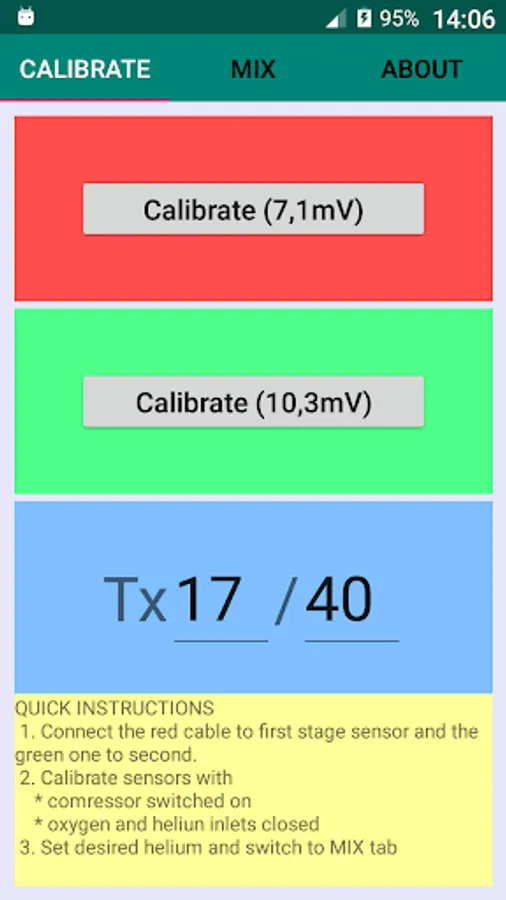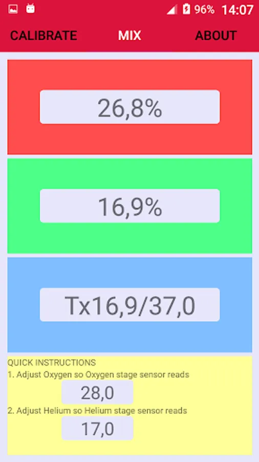 TrimixMix measures both oxygen sensors, based on the readings calculates trimix and suggests corrections of the oxygen and helium inlets.