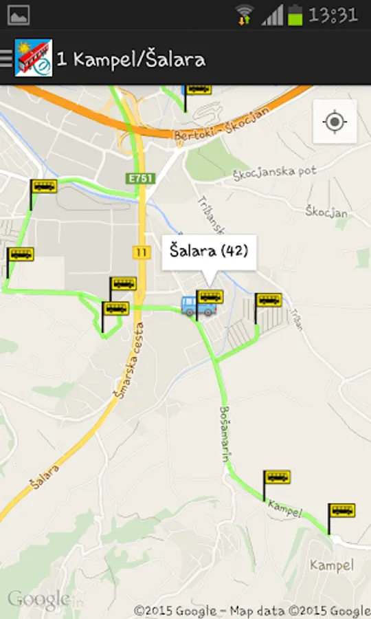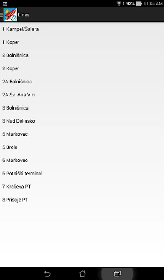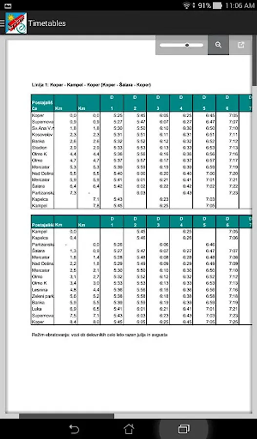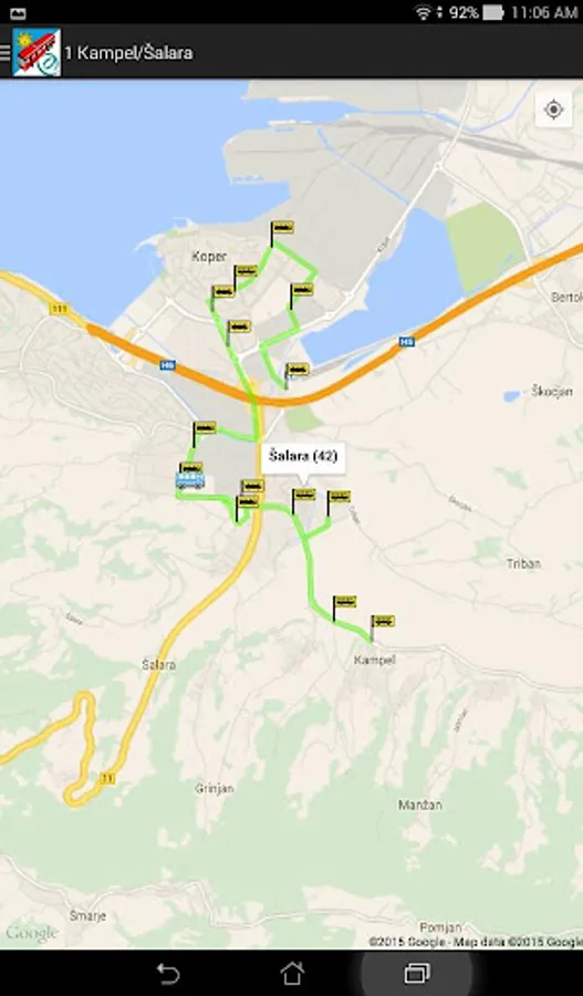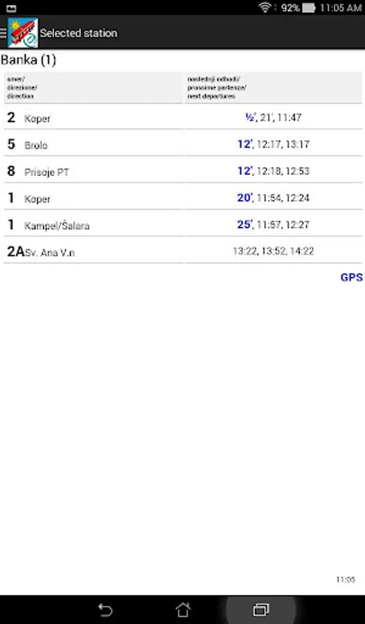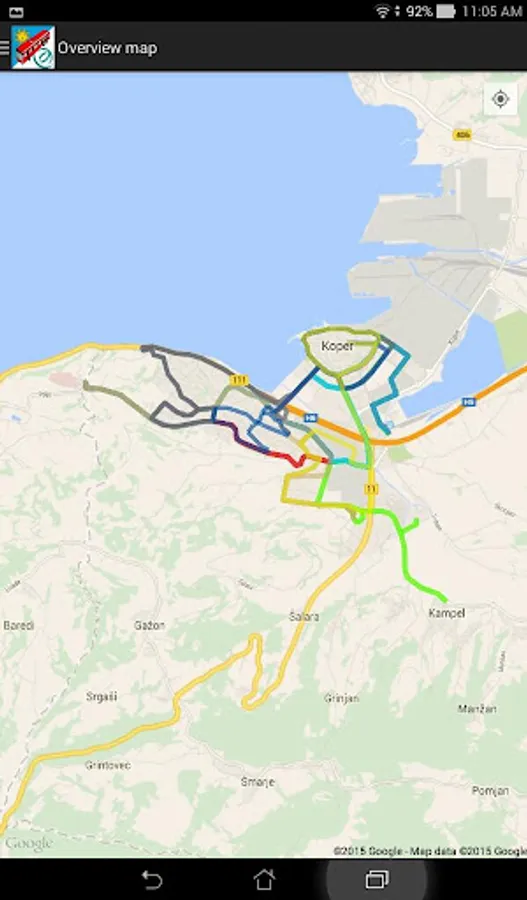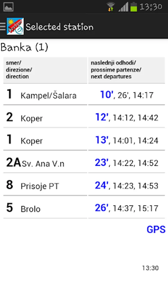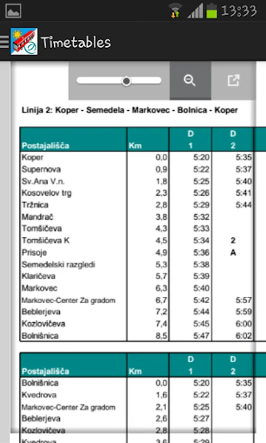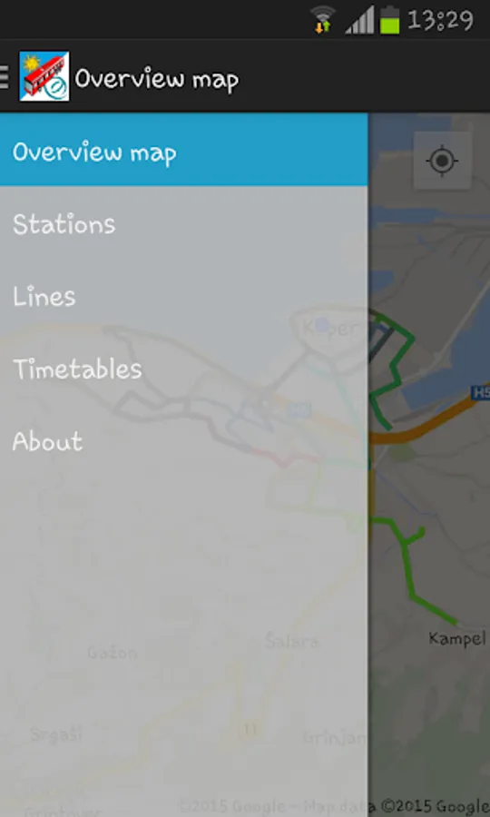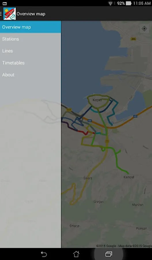 - Overview map: an interactive map that allows user to access all the routes and bus stops available in Koper public transport system. When selecting a bus stop a window showing next departures pops up. System map enables users to use Real-time GPS map of nearest stops.