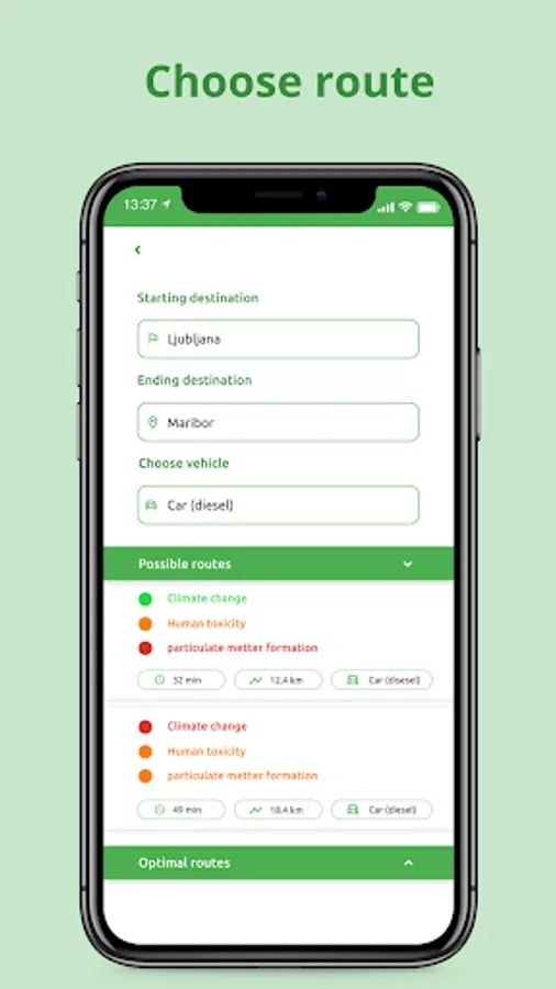 Rešitev, ki jo razvijamo pod mentorstvom doc. dr. Matevža Obrechta iz Fakultete za logistiko, ki je idejni vodja projekta, je orodje/aplikacija, ki opredeljuje povezovanje dostopnih podatkov več različnih podatkovnih baz s področja izbora poti na osnovi podatkov GPS (Google Maps), okoljske presoje transporta z različnimi osebnimi prevoznimi sredstvi ter uporabniku pove kakšen je okoljski vpliv transporta iz točke A v točko B. Ponuja tudi alternativne poti in za vsako prikaže okoljski vpliv osnovan na več okoljskih kazalnikih (emisije, trdi delci, poraba vode, raba prostora, raba energije, vpliv na zdravje ljudi) ne le na parcialni oceni izpustov kot posledica porabe goriva. Nadalje rešitev omogoča izbiro ne samo najkrajše ali najhitrejše poti kot npr. splošno uporabljan Google Maps, ampak tudi okoljsko najprimernejše alternative za vsako pot (npr. v službo, na dopust, v trgovino, v drug kraj). S tem neposredno omogoča spreminjanje in prilagajanje potovalnih navad in minimiranje okoljskih vplivov. Ker raziskave kažejo, da javnost na splošno slabo pozna okoljske vplive in pomen npr. emisij v g/km bomo poseben poudarek namenili jasnemu in razumljivemu prikazu okoljskih vplivov in njeni interpretaciji.