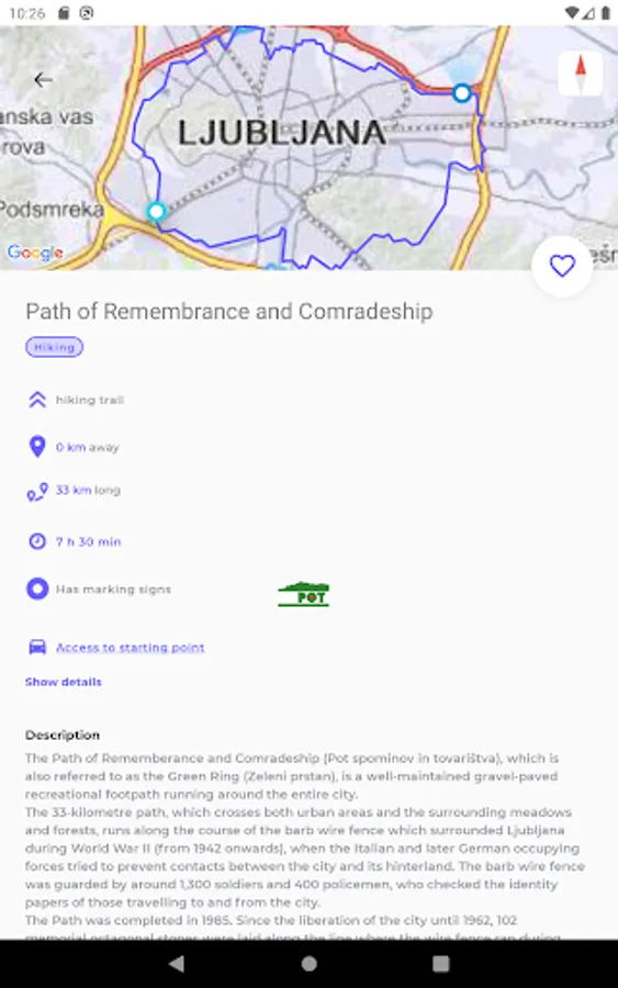 Application includes data about the most popular and favourite Slovenian transversals, which includes but is not limited to the Slovenian mountain path or transversal, European walking path E6 and E7, Via Alpina, Pot miru, Via Pomurje, and Juliana trail. It includes popular walking trails like Path of remembrance and comradeship, the route of health and friendship more commonly known as Parenzana, different educational trails and many other.