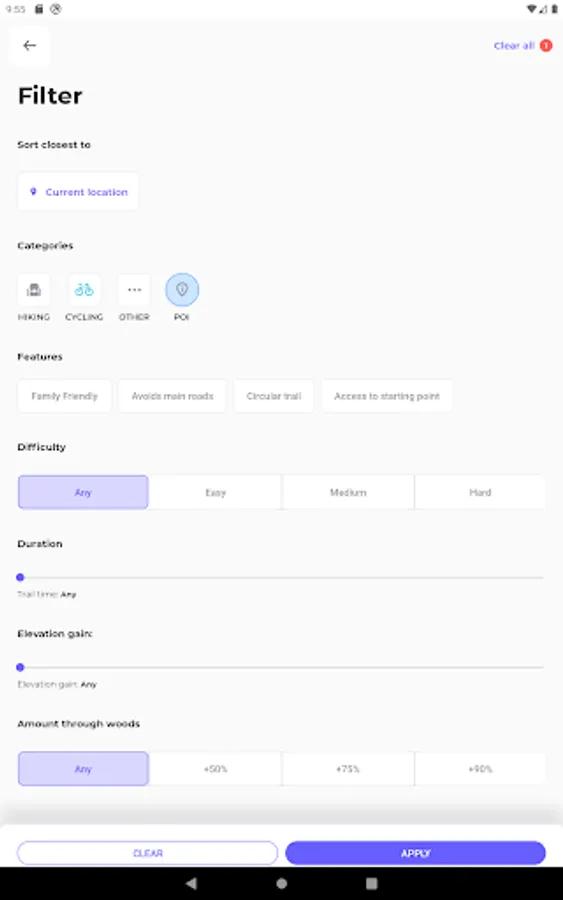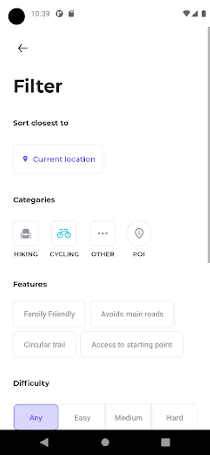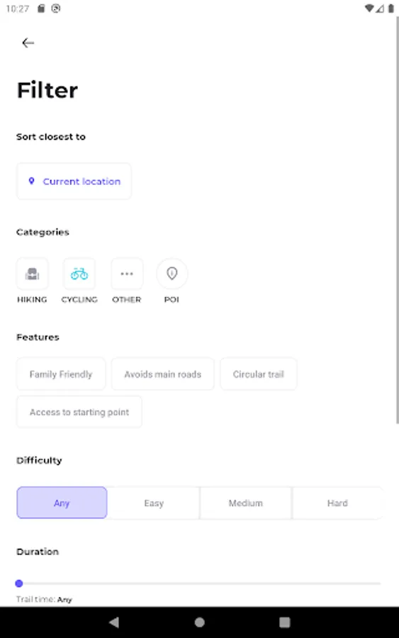 - You can filter trails by difficulty level, duration, distance, family friendliness, circular trails, etc.