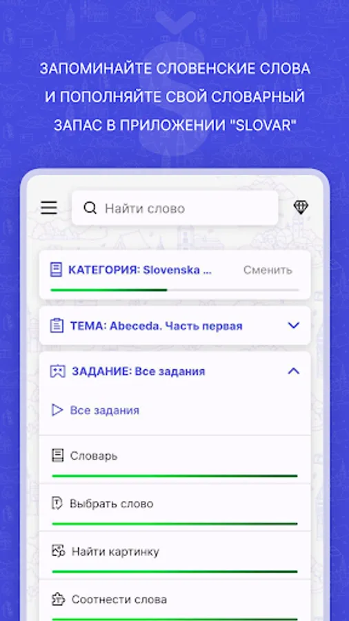 - A free starter kit "Alphabet" and "500 first words in Slovenian", which you can get for diamonds for free;